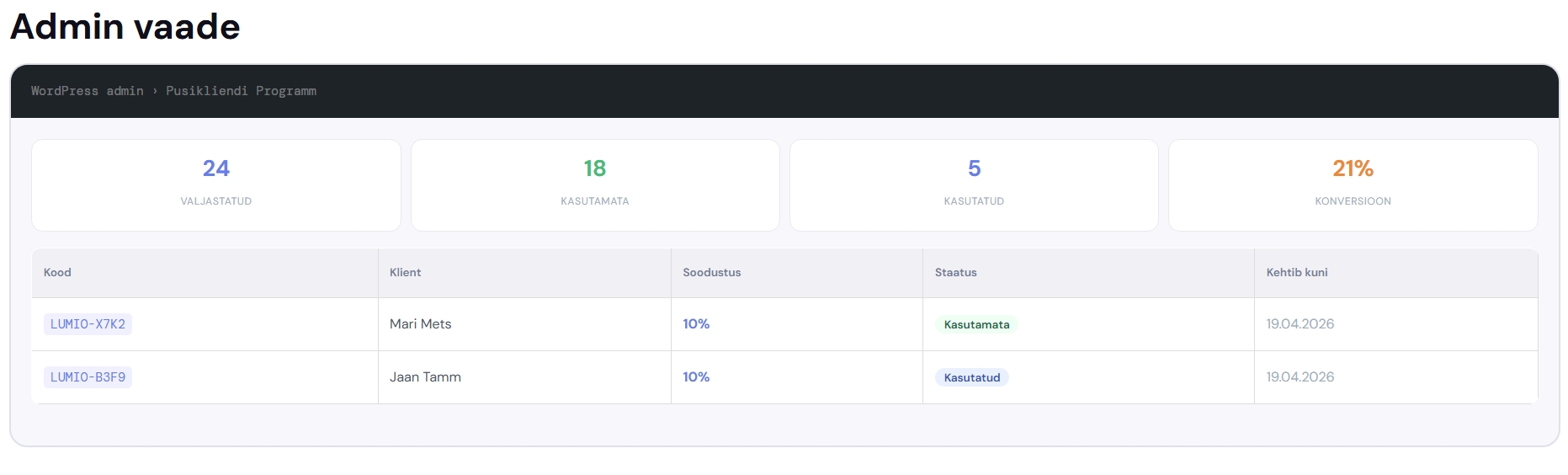Sooduskoodidel põhinev püsikliendiprogramm toob kliendid Sinu WooCommerce veebipoodi tagasi. Pärast igat ostu genereeritakse kliendile unikaalne ühekordne kupong, mida järgmise ostu tegemisel kasutada või jagada oma ringkonnaga. Määra ise Sooduskoodi väärtus ja aegumistähtaeg. Lahendus on 100% automatiseeritud ning tulemused garanteeritud!