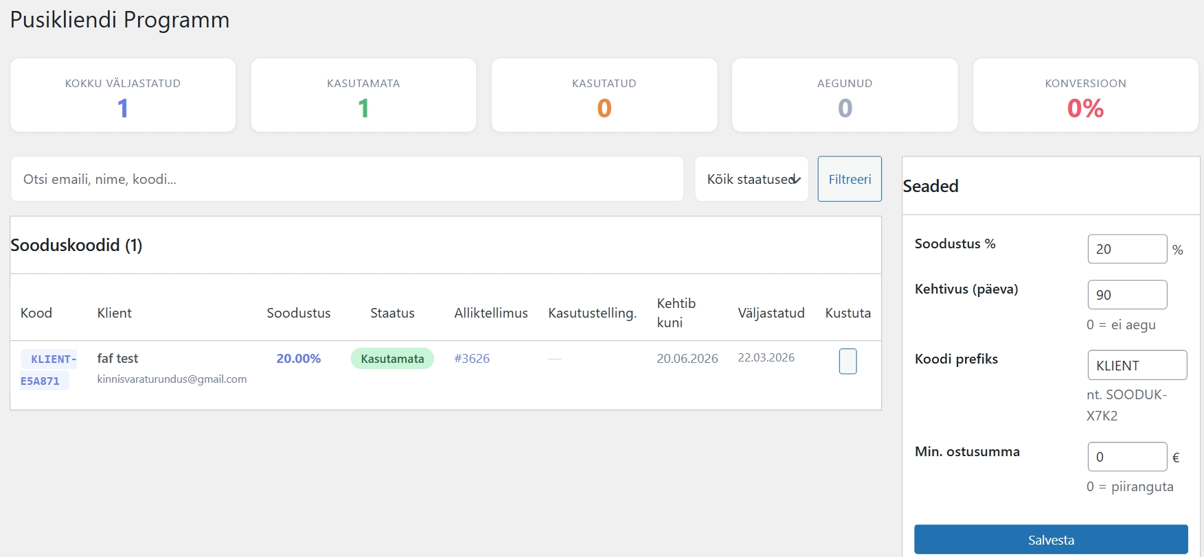 3)Reaalajas ülevaade sooduskoodi kasutamise kohta ning konversioonimäära arvutamine
