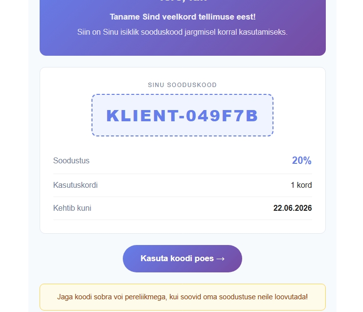 1)Klient saab kohe pärast ostu e-maili teel unikaalse sooduskoodi, mida saab kasutada järgmisel korral või jagada seda oma ringkonnaga (Genereeritakse automaatselt WooCommerce kupong)