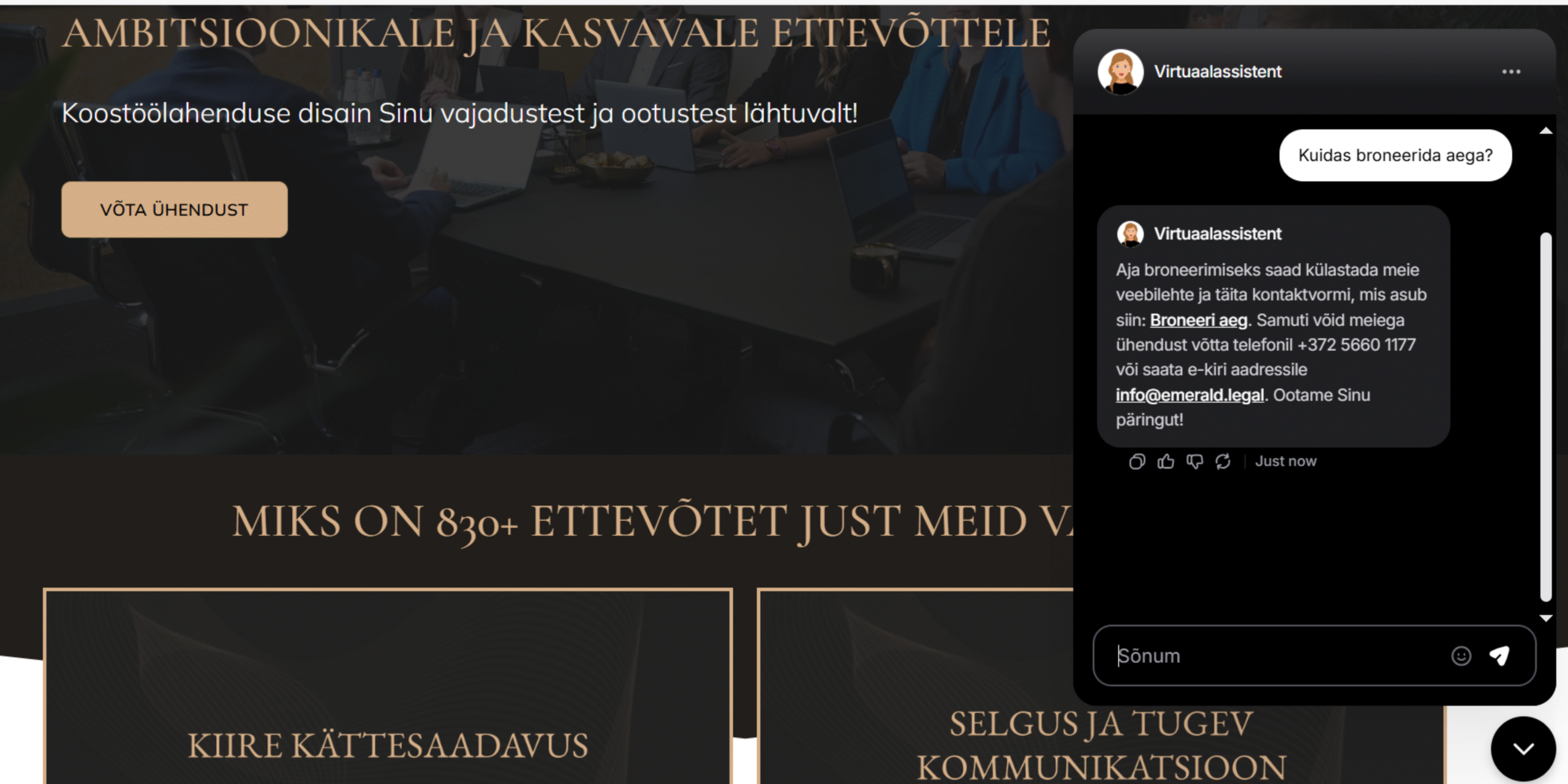 • Lihtne seadistada WordPressis – paigaldus ja disain on tehtav 15 minutiga. Sellele järgneb AI agendi treening vastavalt valdkonnale/ettevõttele.